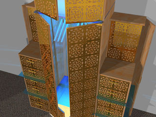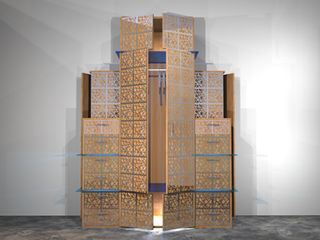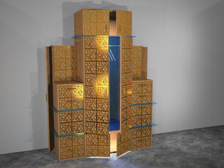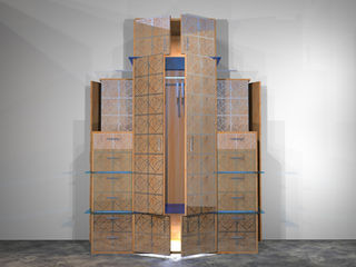 La grande penderie "Cubique" est une structure générale en bois habillée de placages en métal chrome ou laiton en façade.