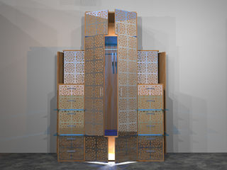L'armoire penderie "Sousbois" est une structure générale en bois habillée de placages d'éléments en métal chrome ou laiton en façade.